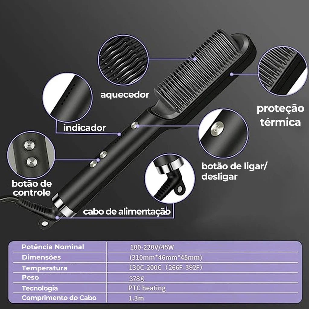 Transforme seu cuidado diário com barba e cabelo em uma experiência profissional, segura e eficiente. Este aparelho combina pente alisador e escova aquecida, ideal tanto para alisar fios grossos quanto modelar barbas com precisão — com proteção anti-queimadura para evitar danos à pele e aos fios.